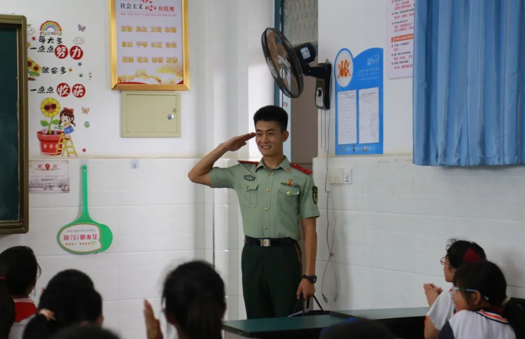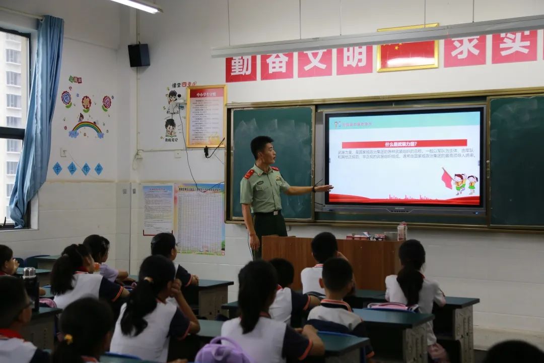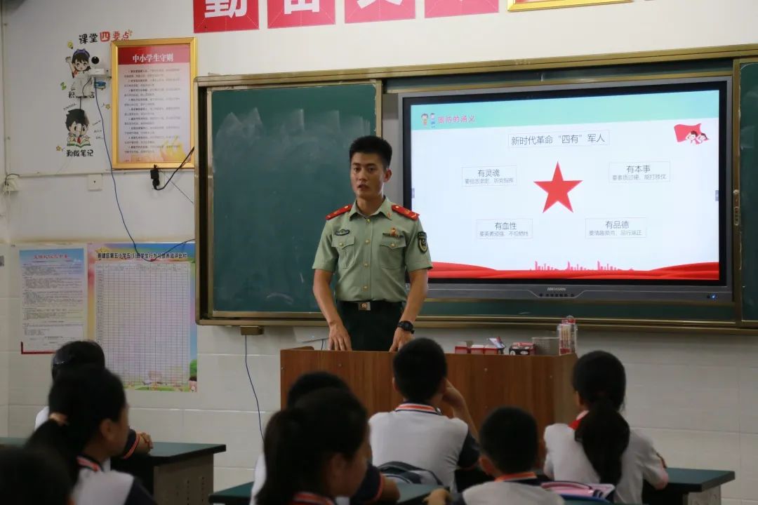 “同学们,你们认为什么是军人?”来自江西武警总队南昌支队的官兵冯程通过这个问题展开了讲述,通过一段段视频,向同学们展现了中国军人的青春与热血;通过一张张图片,为同学们介绍了我们国家的几大军种和不同军种的军旗,展示了我们国家的军事武装力量。78年前,中国人民经过14年的浴血奋战,终于赢得了抗日战争的伟大胜利。在这场民族解放战争中,中国人民进行了艰苦卓绝的斗争,终于取得了人民革命的伟大胜利。雄关漫道真如铁,而今迈步从头越。如今,中国的军事力量日益增强,曾经的历史是为了让我们珍惜来之不易的和平,让同学们以史为鉴,面向未来。