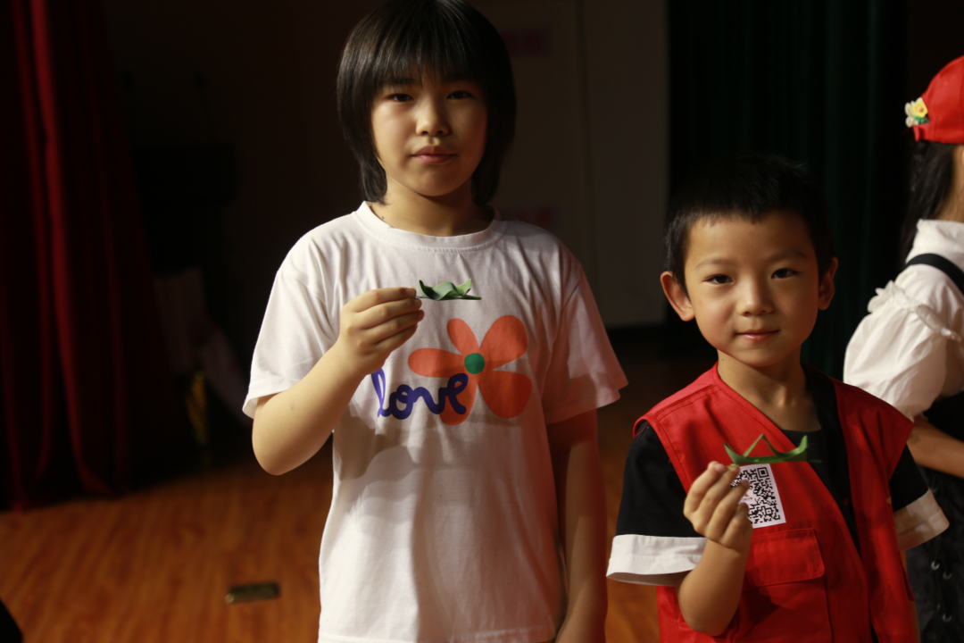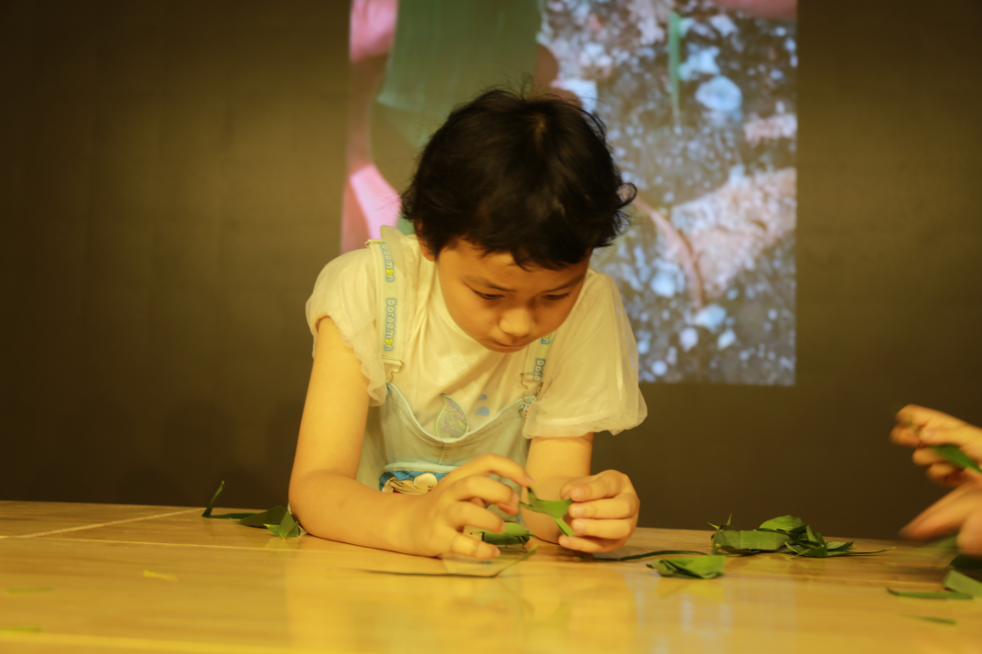 赛龙舟是端午节最重要的特色民俗活动,通过视频和讲解员老师的细心指导,同学们利用青竹叶,一双双稚嫩的小手“忙碌”地穿梭在一张张翠绿欲滴的竹叶间,巧妙地折出了一艘艘活灵活现的小船只,开始了一场不一样的“赛龙舟”。