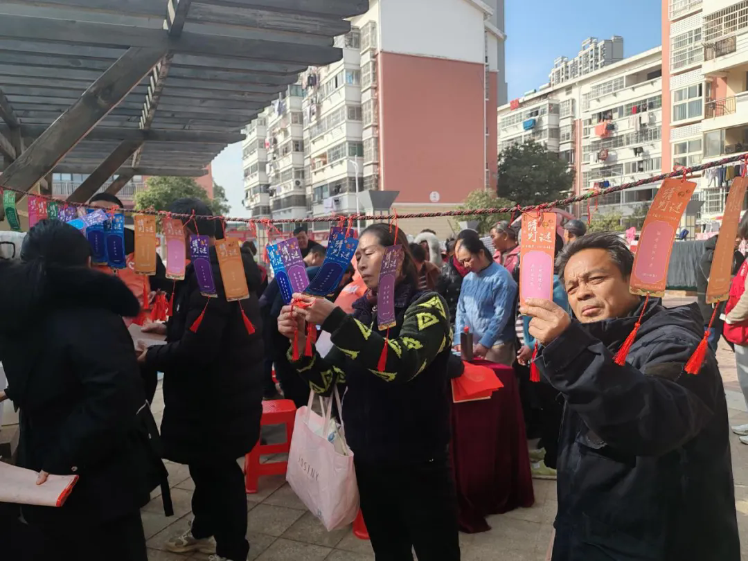 活动现场,书法家挥毫书写春联,居民们围聚欣赏,挑选心仪之作,欢声笑语不断。猜灯谜区域居民们或沉思、或讨论,谜底揭晓时欢呼阵阵,现场充满浓厚文化气息。